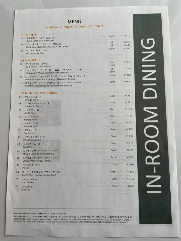 インルームダイニング情報も載せておきます。ペプシコーラがグラスで1210円ってものすごーく高いと思うんです(汗)。