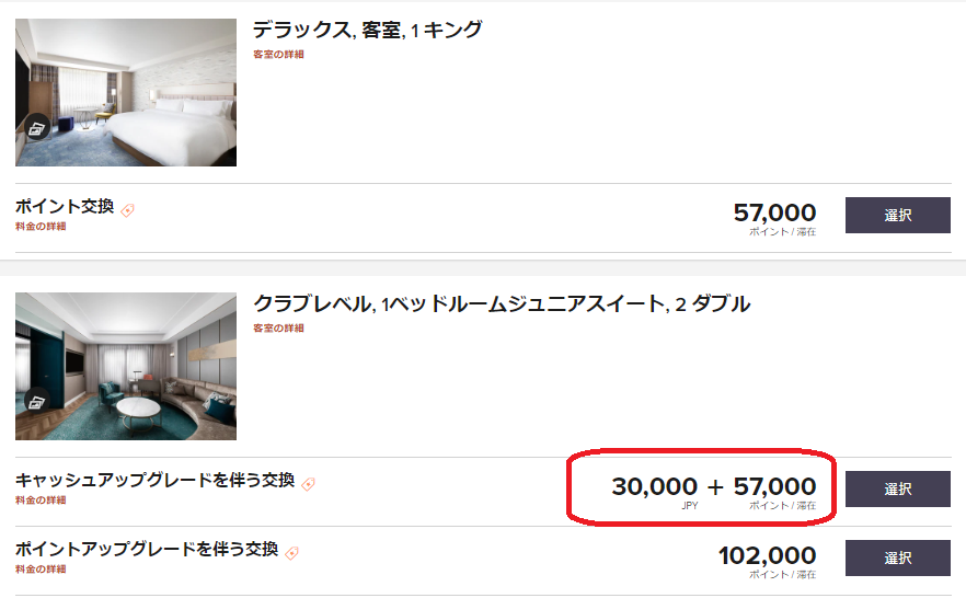 基本的にポイント宿泊はボトムのお部屋しか予約できませんが、キャッシュと組み合わせることでクラブフロアに事前アップグレードできるのは便利です。