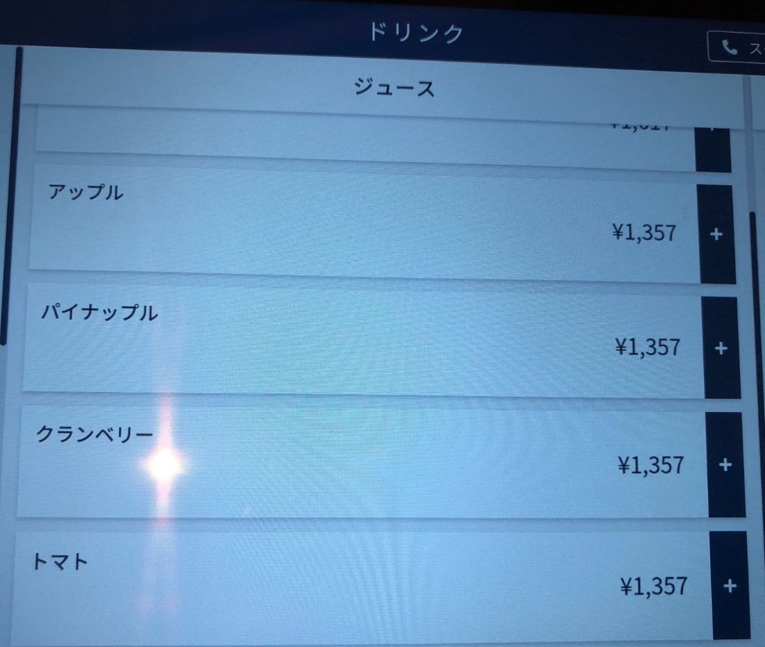 | ジュース(オレンジ、アップル、グレープフルーツ、パイナップル、トマト) | 1357円 |