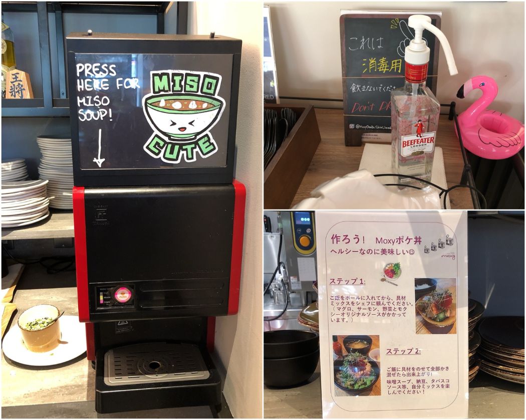 珍しい味噌汁マシーン。名物Moxyポケ丼もセルフスタイルでたべられます。