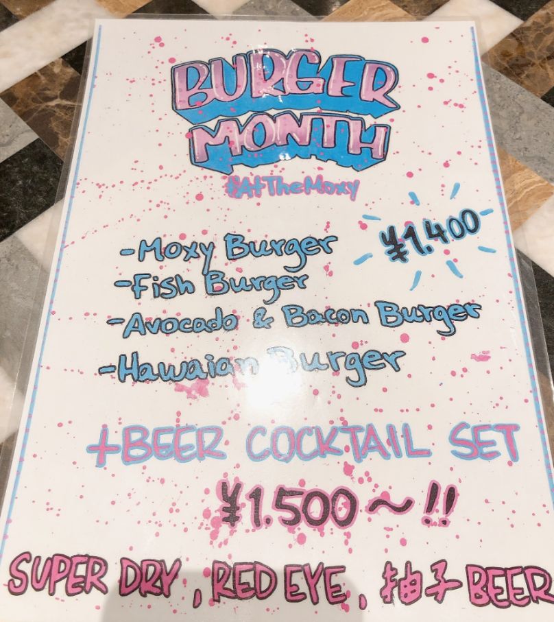 お得情報!モクシーバーガーにプラス100円でビール付き(上のスリムなグラス)にでき、さらに100円プラスするとビールの量が多くなります。しかも昼間もOK!