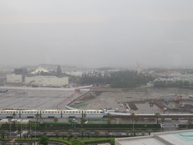 雨が降って霞んだ朝の、残念なTDL風景。夜はわからなかったけど、手前に何かできる感じで工事中。ホテルだったらTDL見えなくなるような・・・。
