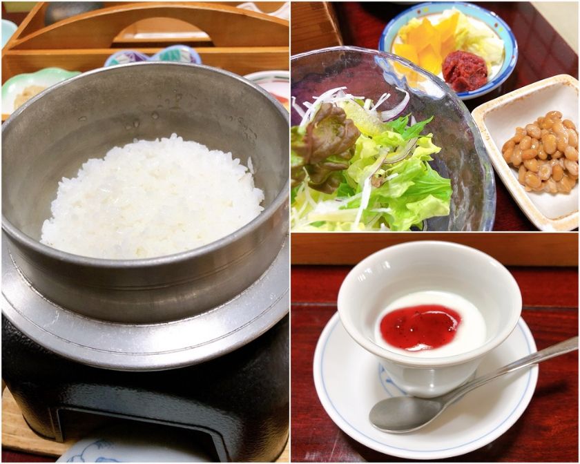 朝からモリモリでてきます。ご飯は1人ずつお釜炊き。右上にちらりと見えている火は、豆乳豆腐鍋。このお汁が相当美味しかったのに、写真を撮りそこなっていました(涙)。団子汁も優しい味。