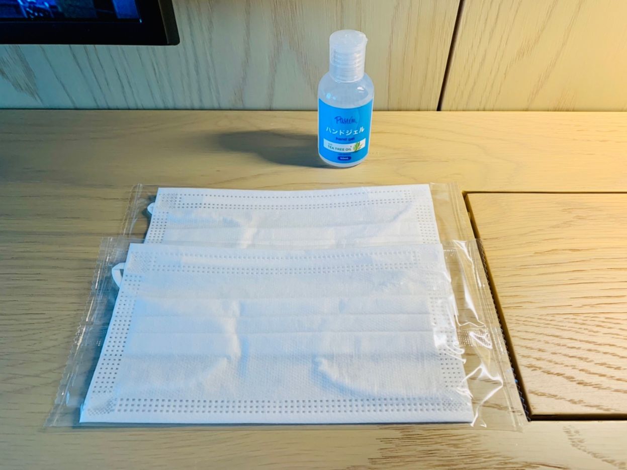 デスク上にはマスクとハンドジェルも用意されていました。