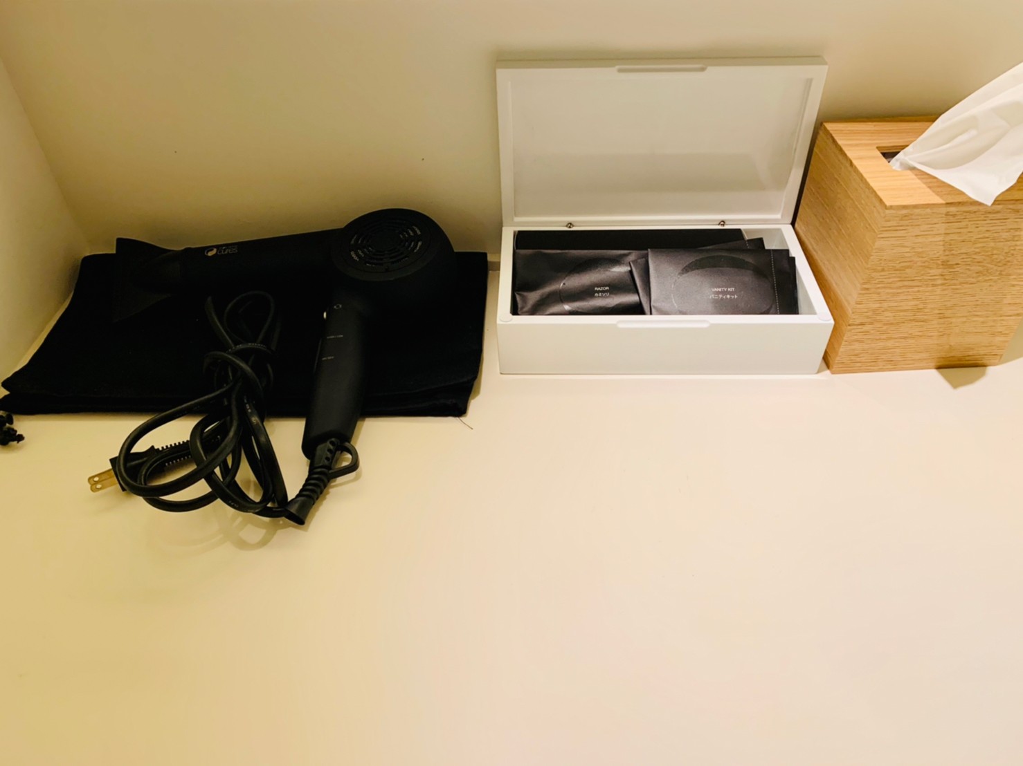 白いボックス内には、歯磨きセット、ヘアブラシ、シャワーキャップ、カミソリ、シェービングフォーム、綿棒、コットン。
